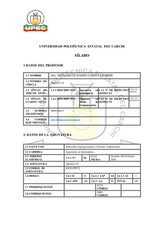 Este documento presenta el sílabo de la asignatura Optativa IV dictada por el profesor MSc. Hidalgo Guijarro Jairo Vladimir en la Universidad Politécnica Estatal del Carchi. El sílabo incluye la información del profesor, datos de la asignatura, construcción del conocimiento a través de unidades temáticas, prácticas y experimentación, y bibliografía. La asignatura abordará temas como aspectos básicos de redes de computadoras, protocolos de enrutamiento, conmutación, listas de control de ac