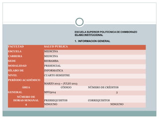 Este documento presenta el sílabo de la asignatura Informática 1 para estudiantes de cuarto nivel de la carrera de Medicina en la Escuela Superior Politécnica de Chimborazo. El sílabo describe la información general de la asignatura, sus objetivos, contenidos organizados en 6 unidades temáticas, estrategias metodológicas, uso de tecnologías, resultados de aprendizaje y ambientes de aprendizaje.