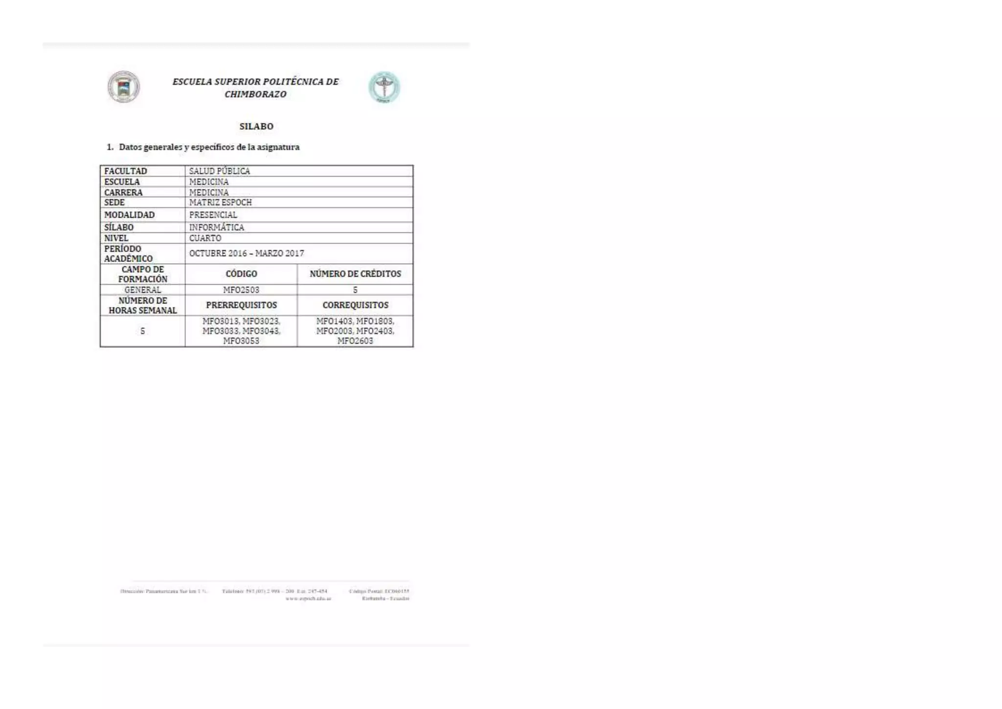 Silabo de la asignatura de informática impartida a los alumnos de cuarto nivel de la carrera de medicina.