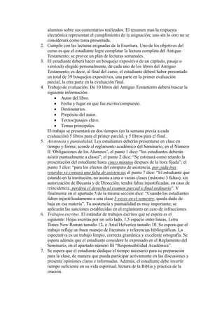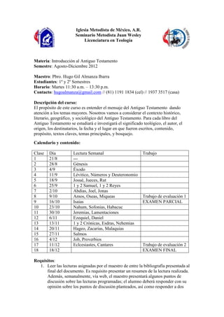 El curso de Introducción al Antiguo Testamento busca comprender su mensaje a través del análisis de temas mayores y contexto histórico, literario, y sociológico de cada libro. Los estudiantes deben realizar lecturas semanales, resúmenes, y bosquejos expositivos, así como cumplir con evaluaciones porcentuales que incluyen trabajos escritos y exámenes. Se enfatiza la asistencia puntual y la dedicación al estudio y la vida espiritual del estudiante.