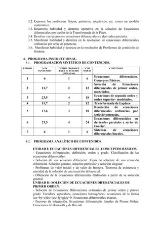 Este documento presenta el sílabo de la asignatura de Matemática IV de la Facultad de Ingeniería de la Universidad Nacional de Cajamarca. La asignatura cubre temas sobre ecuaciones diferenciales ordinarias y parciales. El curso dura 17 semanas y se divide en 7 unidades que cubren conceptos básicos de ecuaciones diferenciales, solución de ecuaciones de primer orden, ecuaciones de orden superior, transformada de Laplace, series de potencias, ecuaciones en derivadas parciales y sistemas de ecuaciones diferencial