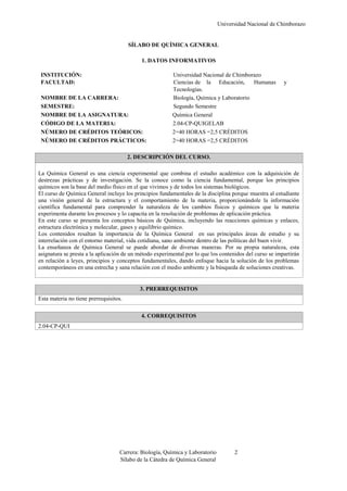 Este sílabo describe el curso de Química General de la Universidad Nacional de Chimborazo. Presenta la información del curso incluyendo los datos de la institución, la carrera, el semestre y la asignatura. Explica los objetivos generales y específicos del curso, así como los contenidos, resultados de aprendizaje y evidencias de evaluación organizados en cuatro unidades temáticas: conceptos fundamentales de química, periodicidad química, enlace químico y estado de oxidación, y nomenclatura química inorg