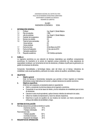 Este documento presenta el silabo para el curso de Ingeniería Económica en la Facultad de Ingeniería en Industrias Alimentarias de la Universidad Nacional del Centro del Perú. El curso dura 9 semanas y cubre temas como tasas de interés, indicadores de rentabilidad, costos anuales equivalentes, modelos de depreciación, y análisis de equilibrio, sensibilidad y riesgo. Los estudiantes serán evaluados a través de exámenes, trabajos individuales y grupales, y presentaciones orales
