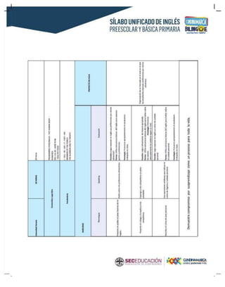 Este documento presenta un resumen del syllabus unificado de inglés para las instituciones educativas oficiales del departamento de Cundinamarca. La Secretaría de Educación agradece a los docentes que participaron en la creación de este syllabus, el cual provee herramientas pedagógicas para el desarrollo de competencias en inglés de acuerdo con los estándares nacionales. El syllabus fue diseñado para mejorar la enseñanza del inglés en apoyo del plan de bilingüismo del departamento.