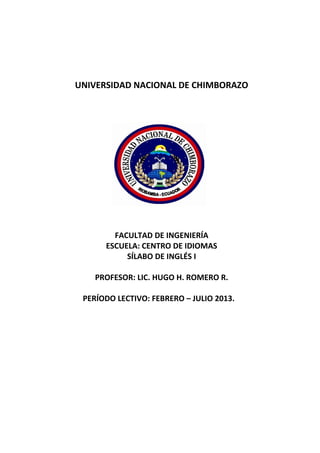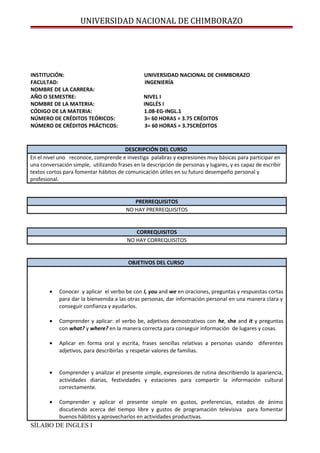 El documento presenta el sílabo de la asignatura Inglés I de la Facultad de Ingeniería de la Universidad Nacional de Chimborazo. El curso tiene una duración de un semestre y busca que los estudiantes reconozcan, comprendan y apliquen palabras y expresiones básicas del idioma inglés para participar en conversaciones simples y describir personas, lugares y actividades. El sílabo describe los objetivos, contenidos, metodología, estrategias de evaluación y bibliografía recomendada para la asignatura.