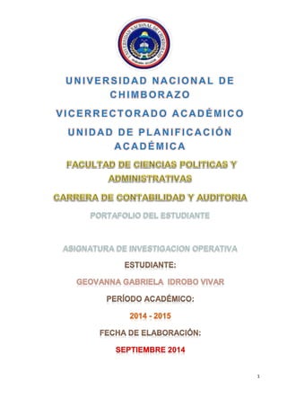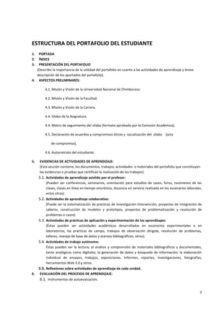 El documento describe la estructura estándar de un portafolio de estudiante, incluyendo una portada, índice, presentación, aspectos preliminares como las misiones y visiones de la universidad y carrera, el sílabo de la asignatura, evidencias de actividades de aprendizaje como trabajos individuales y colaborativos, evaluación del proceso de aprendizaje a través de autoevaluación, coevaluación y heteroevaluación, evidencias de actividades de recuperación pedagógica, un buzón de sugerencias, anex