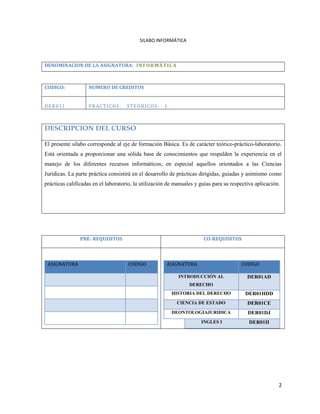 Este documento presenta el silabo de la asignatura Informática de la Facultad de Jurisprudencia de la Universidad Regional Autónoma de los Andes para el semestre de abril a septiembre de 2012. El curso tiene un enfoque teórico-práctico y busca proporcionar una base sólida de conocimientos sobre el manejo de recursos informáticos orientados a las ciencias jurídicas. El silabo describe los contenidos del curso organizados en cinco módulos sobre Microsoft Office, Excel, Access, herramientas colaborativ
