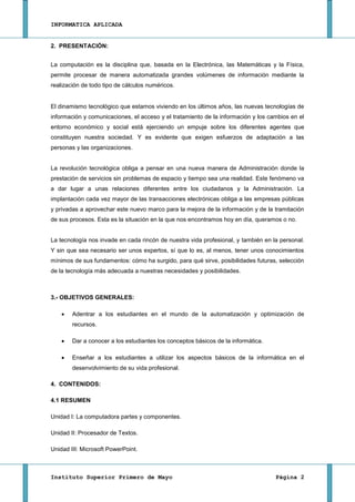 Este documento presenta el plan de estudios para la asignatura de Informática Aplicada en el Instituto Tecnológico Primero de Mayo. La asignatura se compone de 5 unidades que cubren conceptos básicos de hardware, software de productividad como procesadores de texto, hojas de cálculo y presentaciones, e Internet. El objetivo es enseñar aplicaciones informáticas prácticas para el desarrollo profesional de los estudiantes a través de conferencias, ejercicios y evaluaciones teórico-prácticas.