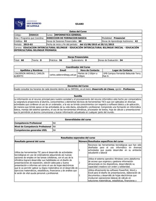 El documento presenta el silabo de un curso de Informática General. El curso tiene una duración de 60 horas presenciales y 42 horas de aprendizaje autónomo. El curso busca que los estudiantes adquieran conocimientos básicos de herramientas TIC y software como Word, Excel y PowerPoint que les permitan desarrollar habilidades para la vida diaria y el ámbito profesional. El silabo incluye la descripción de las unidades y temas a cubrir, los resultados de aprendizaje esperados y el cronograma de actividades.