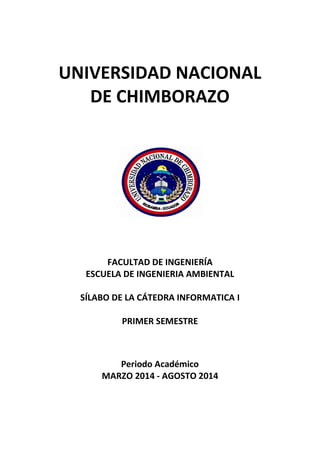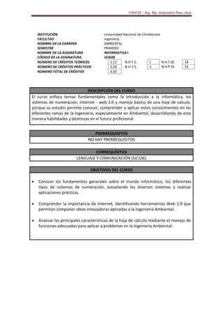 Este documento presenta el sílabo de la asignatura Informática I de la carrera de Ingeniería Ambiental de la Universidad Nacional de Chimborazo. El curso abarca tres unidades: introducción a la informática, internet, y hoja de cálculo. El objetivo es que los estudiantes adquieran conocimientos básicos de informática y puedan aplicarlos en su carrera. El curso se evaluará a través de trabajos, participación, proyectos y exámenes.