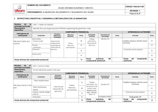 Este sílabo describe el curso de Inglés IV que se ofrece en la carrera de Administración de Empresas Turísticas. El curso tiene un enfoque en el desarrollo de habilidades comunicativas en inglés a través del estudio de diferentes unidades temáticas que cubren temas como la familia, el hogar, el tiempo libre y la educación. El curso se imparte de manera presencial y autónoma utilizando recursos en línea, y evalúa a los estudiantes a través de exámenes parciales y final