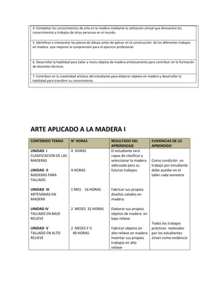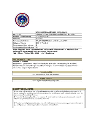 Este documento presenta la descripción de un curso de Arte en la Madera de la Facultad de Ciencias de la Educación Humanas y Tecnologías de la Universidad Nacional de Chimborazo. El curso tiene una duración de 2 semestres y busca desarrollar habilidades para construir y diseñar objetos de madera mediante el uso de herramientas. Los objetivos incluyen aprender a clasificar maderas, tallar en bajo y alto relieve, y aplicar acabados. El curso consta de unidades temáticas con horas asignadas