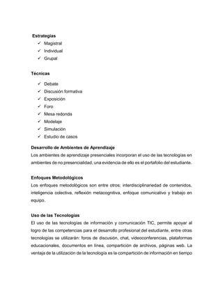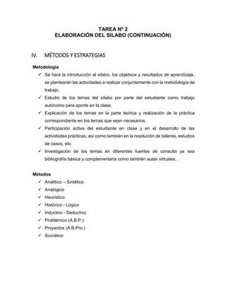 El documento describe el método y las estrategias para elaborar un sílabo para un curso. Incluye una variedad de métodos como clases magistrales, debates, trabajos en grupo, y proyectos. Los estudiantes aprenderán a través de la investigación independiente, resolución de problemas, y presentaciones. El docente utilizará diversas técnicas como exposiciones, foros de discusión y estudios de caso.