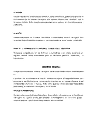 Este documento presenta el sílabo de la cátedra de Inglés Nivel Cinco de la Universidad Nacional de Chimborazo. El curso tiene una duración de 120 horas académicas y busca reforzar y complementar las capacidades comunicativas en inglés de los estudiantes. El curso se enfoca en desarrollar las cuatro habilidades del idioma de manera integral a través de cinco unidades temáticas que abordan tópicos como experiencias pasadas, formas de comunicación, descripción física y planes para el futuro.