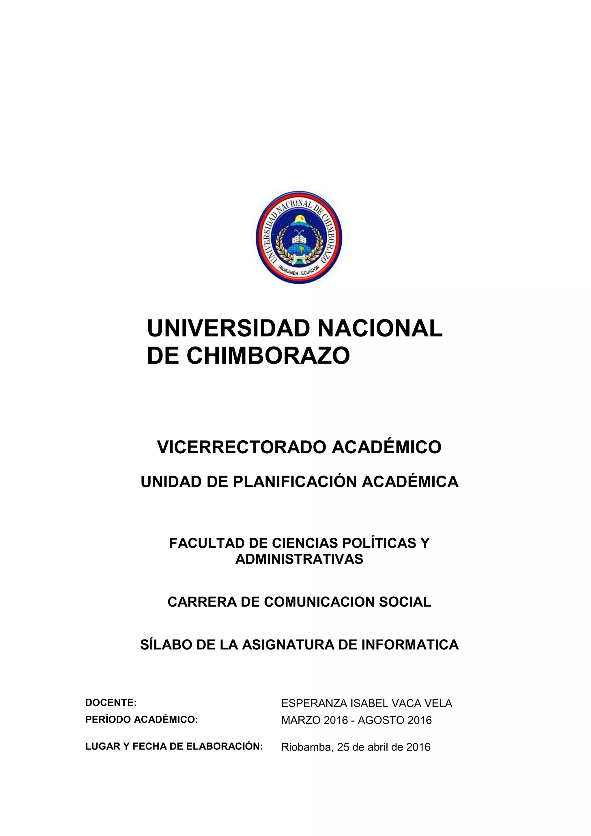 Este documento presenta el sílabo de la asignatura de Informática de la carrera de Comunicación Social de la Universidad Nacional de Chimborazo. El sílabo incluye información general sobre la asignatura, sus objetivos, unidades curriculares y contenidos, así como las metodologías y formas de evaluación. La asignatura se enfoca en desarrollar habilidades en el uso de tecnologías de la información, sistemas operativos, herramientas ofimáticas e Internet en los estudiantes de comunicación social.