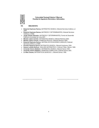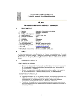 Este documento presenta el sílabo de la asignatura "Introducción a las Matemáticas Superiores" de la carrera de Ingeniería Informática. El curso abarca temas como sistemas de números reales y complejos, matrices y determinantes, y sistemas de ecuaciones lineales. El profesor utilizará métodos como resolución de problemas, trabajo colaborativo y aprendizaje basado en proyectos para desarrollar las competencias matemáticas de los estudiantes.