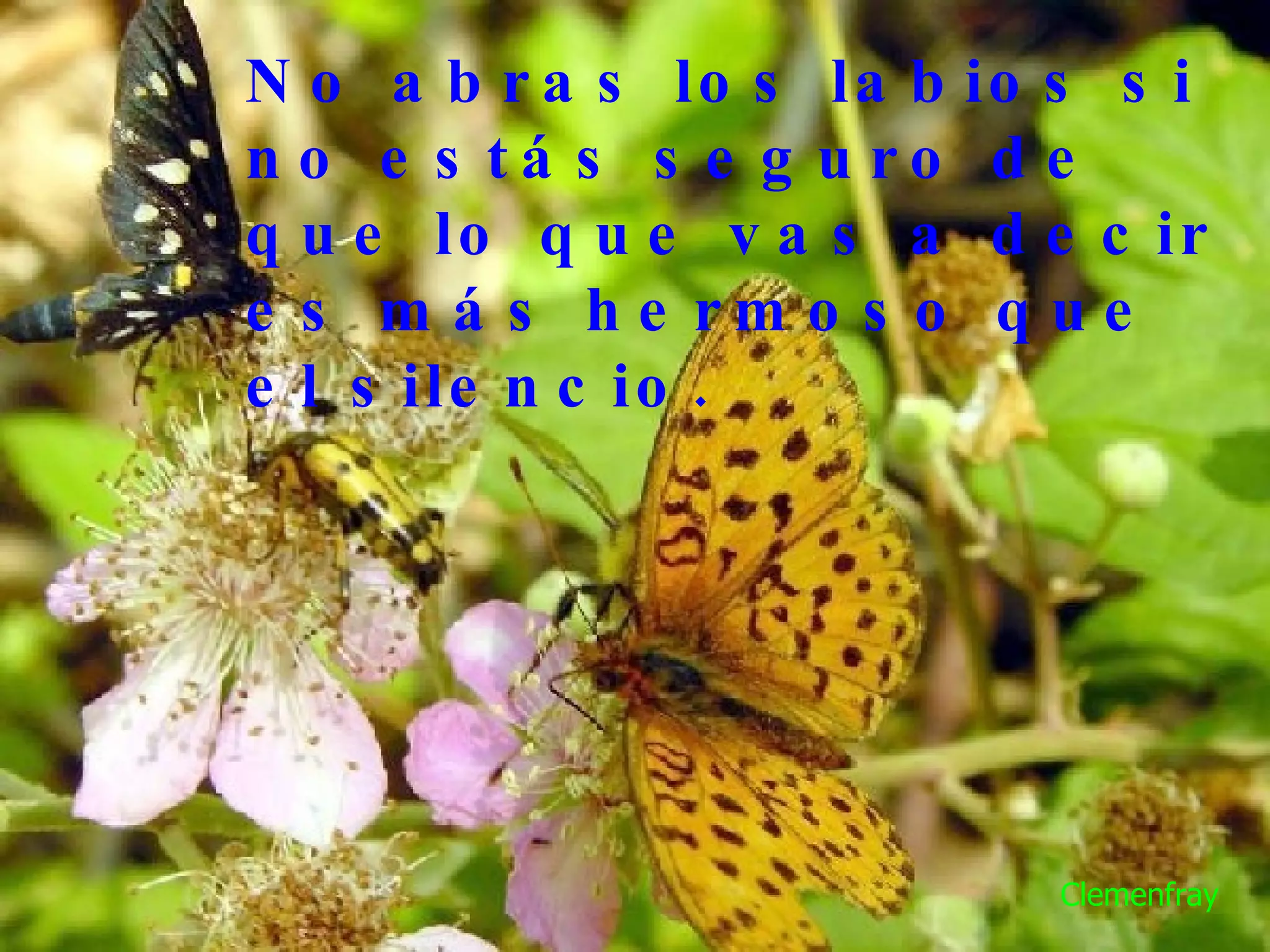 Este documento contiene cuatro citas atribuidas a Clemenfray que enfatizan la importancia del silencio sobre hablar sin pensar. Las citas aconsejan solo hablar si lo que se dice es más hermoso que el silencio, ya que una vez que se habla las palabras dominan sobre uno; mientras que en silencio uno domina sobre sus palabras. También dicen que los sabios no dicen todo lo que saben, mientras que los necios no saben lo que dicen; y que es mejor guardar silencio si no se tiene nada significativo que decir.
