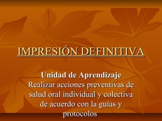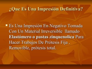 Este documento describe los diferentes tipos de materiales y técnicas utilizadas para tomar impresiones definitivas en odontología, incluyendo siliconas, pasta zinquenólica y modelinas. Explica cómo se manipulan y usan estos materiales para impresiones de prótesis fijas, removibles y totales siguiendo técnicas como la doble mezcla y la doble impresión. Además, detalla los pasos para tomar impresiones con cada material y los instrumentos requeridos.