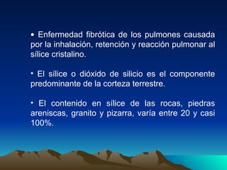 Este documento describe la silicosis, una enfermedad pulmonar causada por la inhalación de sílice cristalino. El sílice se encuentra comúnmente en rocas, arena y otros materiales. La silicosis puede manifestarse de forma crónica, acelerada o aguda, dependiendo de la intensidad y duración de la exposición. Los síntomas incluyen disnea y tos. Los patrones radiológicos van desde pequeñas opacidades hasta fibrosis masiva. No existe un tratamiento efectivo para la silicosis una vez desarrollada.