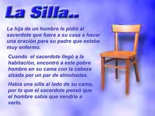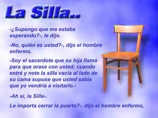 El sacerdote visita a un hombre enfermo a pedido de su hija. El hombre le cuenta que ha estado hablando con Jesús sentado en una silla vacía a su lado por horas cada día durante los últimos cuatro años. Cuando el hombre muere poco después de la visita del sacerdote, su hija encuentra su cabeza recostada en la silla vacía, como si hubiera estado hablando con alguien. El sacerdote cree que el hombre murió en paz después de hablar con Jesús.