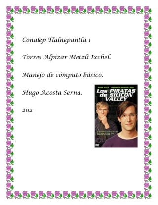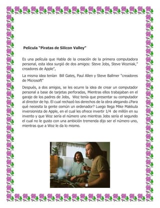 El documento habla sobre la película "Piratas de Silicon Valley" que narra la creación de las primeras computadoras personales por parte de Steve Jobs y Steve Wozniak, fundadores de Apple, y Bill Gates, Paul Allen y Steve Ballmer, fundadores de Microsoft. Describe cómo Jobs y Wozniak trabajaron en el garaje de los padres de Jobs y cómo presentaron su computador en una feria en 1977, mientras que Gates ofreció un sistema operativo a IBM que aún no existía pero que luego compró para ellos.