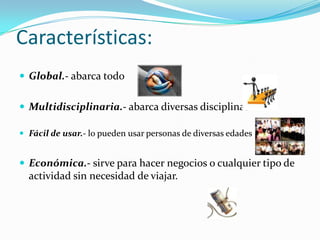 Internet es un conjunto descentralizado de redes interconectadas que utilizan protocolos TCP/IP para funcionar como una red lógica global. Se originó en 1969 con la conexión entre universidades en California y Utah como ARPANET. Es global, multidisciplinaria, fácil de usar y económica para hacer negocios y actividades sin necesidad de viajar.