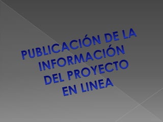 Este documento describe tres métodos para publicar información de un proyecto de Microsoft Project en línea: 1) Copiar la información como una imagen GIF, 2) Almacenar la información como una página web HTML, y 3) Cambiar la apariencia de la página web modificando las plantillas HTML. El objetivo principal es compartir la información del proyecto de forma común.