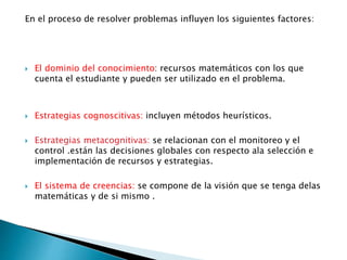 En resolver problemas influyen el dominio del conocimiento del estudiante, las estrategias cognitivas y metacognitivas, y el sistema de creencias. El dominio del conocimiento incluye recursos matemáticos para usar en el problema. Las estrategias cognitivas usan métodos heurísticos. Las estrategias metacognitivas controlan la selección e implementación de recursos y estrategias. El sistema de creencias comprende la visión de las matemáticas y de sí mismo.