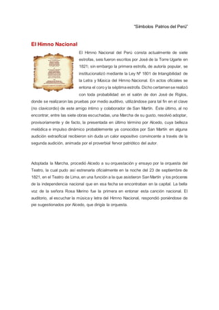 La bandera nacional peruana consta de tres franjas horizontales de igual ancho en rojo y blanco, establecida en 1825. El escudo nacional está dividido en tres campos representando las riquezas naturales del Perú: una vicuña en celeste, un árbol de quina en blanco y una cornucopia derramando monedas en rojo. El himno nacional consta de siete estrofas escritas en 1821 y 1825, y se entona el coro y la séptima estrofa en actos oficiales. La escarapela nacional en