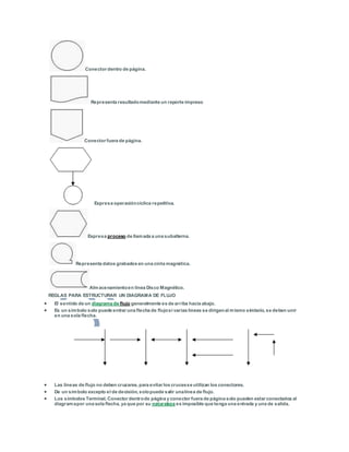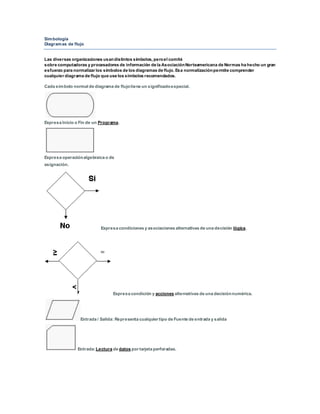 El documento habla sobre los diagramas de flujo y su simbología. Explica que la Asociación Norteamericana de Normas ha normalizado los símbolos para diagramas de flujo para facilitar su comprensión. Describe cada símbolo normalizado y sus significados. También incluye reglas para estructurar correctamente un diagrama de flujo y consideraciones sobre posibles errores en los diagramas.