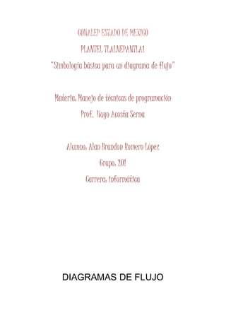 Este documento describe los diagramas de flujo y su simbología básica. Explica que los diagramas de flujo son uno de las principales herramientas para desarrollar programas y que permiten ver con claridad la solución propuesta a un problema mediante el uso de símbolos especiales. También menciona que existen dos tipos de algoritmos: los diagramas de flujo (algoritmos gráficos) y los seudocódigos (algoritmos textuales).