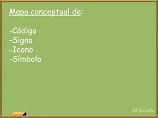 Este documento presenta un mapa conceptual sobre códigos, signos, iconos y símbolos. Explica que los códigos permiten transmitir ideas y experiencias a través de sistemas de signos o símbolos. Los signos pueden simbolizar significados que varían según el contexto, mientras que los iconos son imágenes que representan objetos o ideas de forma analógica o simbólica. Por último, los símbolos nos permiten representar diversas ideas a través de tipos como los religiosos, políticos o artísticos.