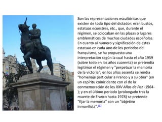 El documento describe varios símbolos, imágenes y monumentos asociados con el régimen franquista en España, incluyendo el águila, el yugo y las flechas, y el Valle de los Caídos. También describe revistas, uniformes, y monumentos erigidos para conmemorar eventos de la guerra civil y glorificar a Franco.