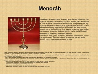 El documento describe varios símbolos judíos importantes como la Menorah, la Estrella de David, las letras JAI, la kipá, el talit, el shofar, la mezuza, los tefilín y la janukiyah. Explica el significado espiritual y religioso de cada uno de estos símbolos en la tradición judía.