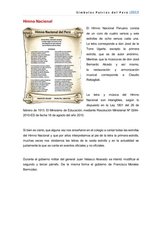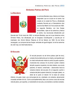 La bandera del Perú está compuesta de tres franjas verticales de igual tamaño, rojas en los extremos y blanca en el medio. El escudo peruano tiene forma de piel de toro y muestra en la parte superior una vicuña, un árbol de quina y una cornucopia derramando monedas de oro. El himno nacional consta de un coro y seis estrofas y actualmente se canta la primera estrofa en eventos oficiales. La escarapela peruana tiene los mismos colores dispuestos verticalmente que la bandera nacional.