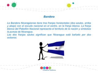 La bandera de Nicaragua tiene tres franjas horizontales azules y blancas, con el escudo nacional en el centro de la franja blanca. El escudo es un triángulo con símbolos que representan la igualdad, la paz, la libertad y la unión de Centroamérica. El pájaro nacional es el Guardabarranco, una ave colorida conocida por su larga cola azul. La flor nacional es la Sacuanjoche, que crece en los árboles de Frangipani. El árbol nacional es el Madroño. El him