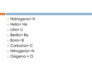 Este documento lista los símbolos químicos de los elementos más comunes, incluyendo hidrógeno, helio, litio, berilio, boro, carbono, nitrógeno, oxígeno, flúor, neón, sodio, magnesio, aluminio, silicio, fósforo, azufre, cloro, argón, potasio, calcio, titanio, cromo, manganeso, hierro, cobre, zinc, kriptón, plata, estaño, yodo, platino, oro, mercurio y plomo. También