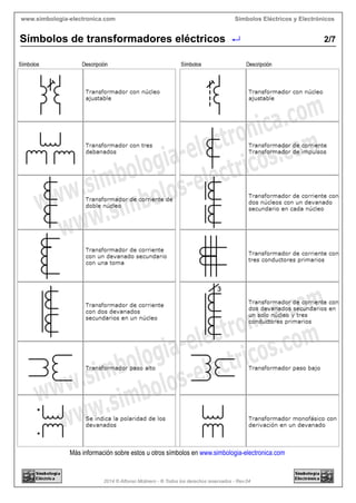 El documento presenta diferentes símbolos utilizados para representar transformadores eléctricos, incluyendo símbolos para transformadores, autotransformadores, transformadores trifásicos y la representación unifilar de transformadores. Explica los símbolos a lo largo de 7 páginas con derechos de autor reservados.