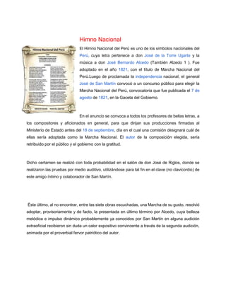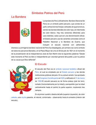 La bandera del Perú consta de tres franjas verticales de igual anchura en rojo, blanco y rojo. La bandera original fue izplegada por primera vez el 28 de julio de 1821 para proclamar la independencia del Perú. El escudo de armas de Perú muestra tres campos con una vicuña, un puma y una estrella de plata. El himno nacional de Perú fue adoptado en 1821 y su letra fue escrita por José de la Torre Ugarte y su música compuesta por José Bernardo Alcedo.