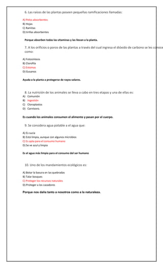 Este documento contiene un ensayo de 10 preguntas sobre ciencias naturales para el 8o año. La estudiante Javiera Norambuena responde cada pregunta justificando su respuesta y eligiendo la opción correcta entre A, B, C o D. Las preguntas cubren temas como las células, los hábitats, la fotosíntesis, la nutrición animal y los mandamientos ecológicos.