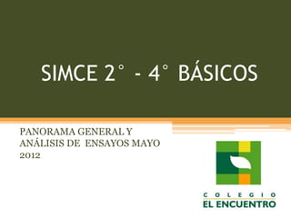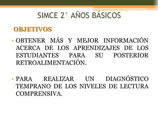 El documento presenta información sobre las pruebas SIMCE de 2° y 4° años básicos. En 2° año, la prueba evalúa habilidades de lectura comprensiva a través de preguntas de selección múltiple, emparejamiento, ordenamiento y completado. En 4° año, la prueba evalúa habilidades de lectura, matemáticas, historia y ciencias sociales.