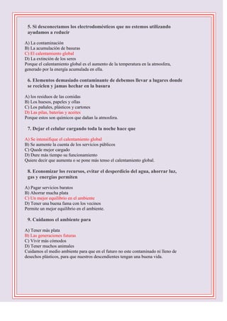 Este documento presenta las respuestas a un examen de ciencias naturales sobre el cuidado del medio ambiente. La mayoría de las respuestas indican que cuidar el medio ambiente es responsabilidad de todas las personas y que actividades como desconectar electrodomésticos innecesarios, reciclar pilas y baterías, y sembrar árboles ayudan a reducir el calentamiento global y mantener un mejor equilibrio ambiental para las generaciones futuras.