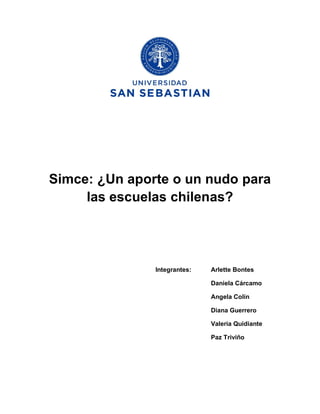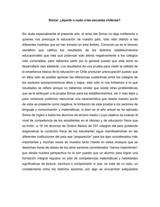 Este documento analiza si el Simce (Sistema de Medición de la Calidad de la Educación) aporta o perjudica a las escuelas chilenas. Se argumenta que el Simce se enfoca demasiado en lenguaje y matemáticas, descuidando otras áreas, y que genera una competencia negativa entre escuelas. También critica el "semáforo" que estigmatiza a escuelas de bajos ingresos. En general, se concluye que mientras existan desigualdades en el sistema educativo, medidas como el Simce solo sir