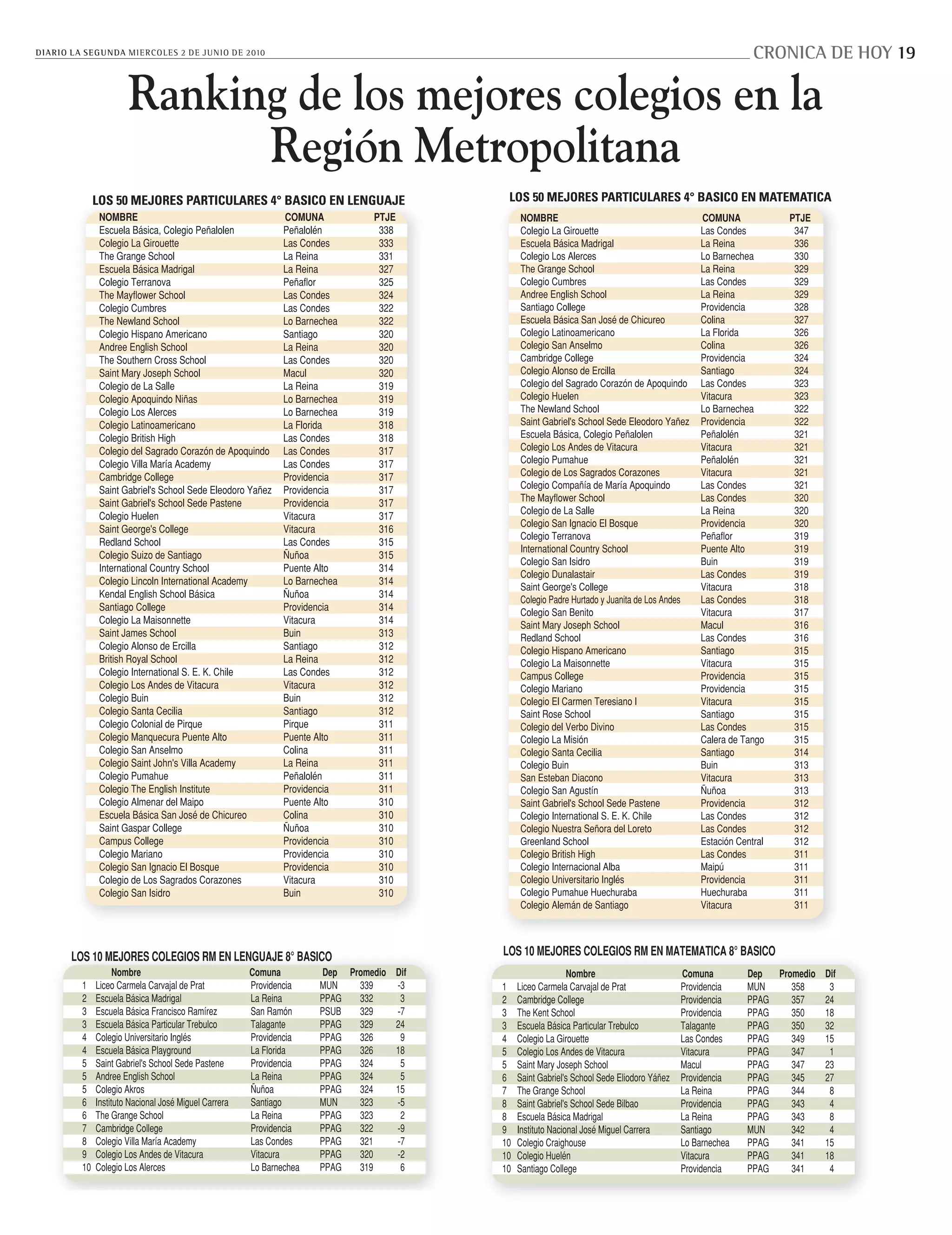 Este documento presenta los resultados del SIMCE de 4° básico en colegios de la Región Metropolitana. Incluye una tabla con el nombre de cada colegio, su dependencia, grupo socioeconómico, y los puntajes obtenidos en Lenguaje, Matemáticas y Comprensión del Medio, así como su avance o retroceso respecto al año anterior. Lista más de 100 colegios de la región, mostrando sus resultados individuales en la prueba SIMCE aplicada en 2009.