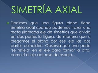 El documento describe dos tipos de simetría en figuras planas: la simetría axial, donde una recta divide la figura en dos partes iguales que se reflejan una en la otra, y la simetría central, donde un punto divide la figura de tal forma que cada punto tiene su correspondiente a una distancia igual del otro lado del punto central. La simetría central es un caso particular de simetría rotacional cuando el ángulo de rotación es de 180 grados.
