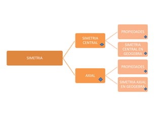 Este documento describe las propiedades de la simetría central y axial. La simetría central hace corresponder puntos a ambos lados de un centro de tal manera que la distancia de cada punto al centro es la misma. La simetría axial hace corresponder puntos a ambos lados de un eje de forma que el segmento que une cada punto con su imagen es perpendicular al eje. El documento explica estas transformaciones geométricas y sus propiedades en GeoGebra.