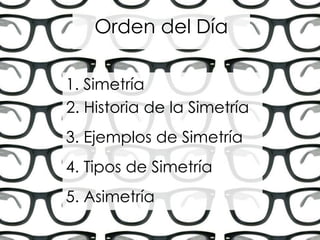 El documento trata sobre la simetría y asimetría. Explica que la simetría se refiere a la correspondencia exacta en tamaño, forma y posición de las partes de un todo. Luego describe brevemente la historia de la simetría y algunos ejemplos como las manos humanas, moléculas y estructuras arquitectónicas. Finalmente, define varios tipos de simetría como la bilateral, rotacional y quiral, y explica que la asimetría se refiere a figuras cuyos pesos compositivos son