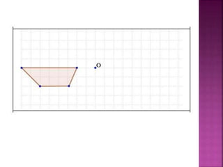 Este documento describe la simetría central y la simetría axial. La simetría central es una rotación de 180° alrededor de un punto central, transformando un punto A en otro punto A' siendo el punto central el medio del segmento AA'. La simetría axial transforma un punto A en A' siendo el eje de simetría la mediatriz del segmento AA'. El documento proporciona instrucciones para encontrar los puntos simétricos y realizar simetrías sobre figuras.