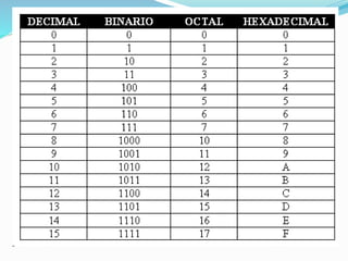 El documento habla sobre los sistemas de numeración, incluyendo el sistema decimal (base 10), binario (base 2), octal (base 8) y hexadecimal (base 16). Explica que los sistemas de numeración utilizan símbolos llamados cifras y están basados en una base determinada. También describe los métodos para convertir entre sistemas de numeración usando el teorema fundamental de la numeración y divisiones sucesivas.
