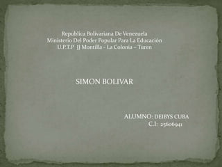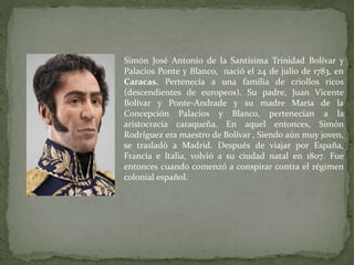 Simón Bolívar nació en Venezuela en 1783 en una familia rica. Recibió educación en España y Europa. Regresó a Venezuela en 1807 y comenzó a conspirar contra el régimen colonial español. Lideró las fuerzas independentistas venezolanas en la lucha contra los realistas españoles entre 1813 y 1821, logrando la independencia de Venezuela. Posteriormente, lideró la creación de la República de la Gran Colombia que incluía los territorios de Venezuela, Colombia y Ecuador, siendo su primer presidente. Murió cerca de Santa Marta